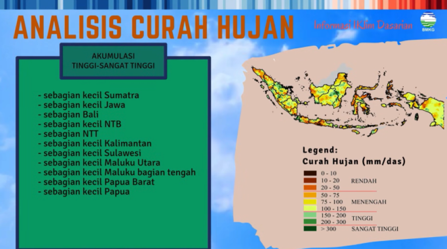 Pada Dasarian I Januari 2026, sebagian besar wilayah Indonesia diprakirakan mengalami curah hujan kategori rendah hingga menengah, berkisar 20–150 mm per dasarian. Namun demikian, hujan dengan intensitas tinggi hingga sangat tinggi (lebih dari 150 mm per dasarian) diprediksi terjadi di sejumlah wilayah.