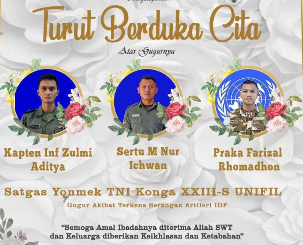 Para purnawirawan yang tergabung dalam Persatuan Purnawirawan TNI Angkatan Darat (PPAD) menyampaikan belasungkawa mendalam atas gugurnya tiga prajurit terbaik TNI saat menjalankan tugas mulia di Lebanon. Para prajurit yang gugur, sedang melaksanakan misi perdamaian dunia di bawah naungan Perserikatan Bangsa Bangsa (PBB).